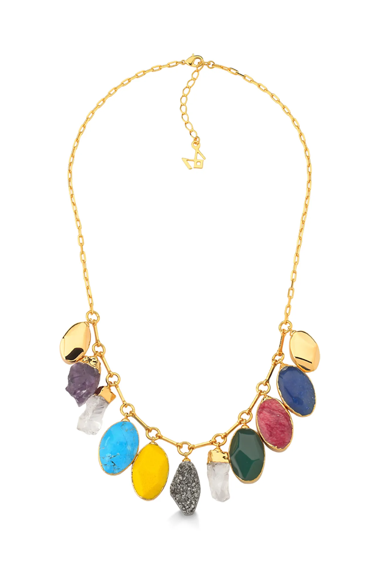 O Colar Alegria Maria Dolores é um maxi colar statement, folheado a ouro, que une cores, formas e texturas em uma peça única. A corrente de elos largos ganha movimento com diversos pingentes de pedras naturais em formatos orgânicos, criando um visual moderno, vibrante e sofisticado. A mistura das pedras traz autenticidade e equilíbrio, tornando a peça perfeita para composições cheias de estilo e personalidade.